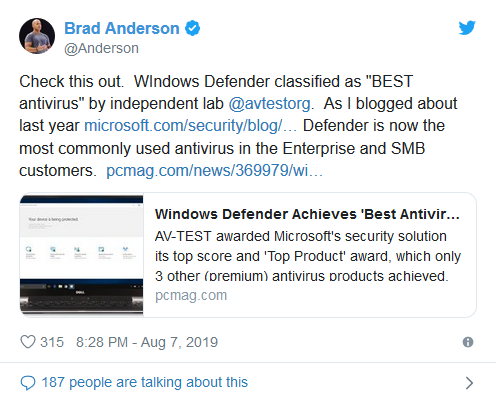 اما با گذر زمان مایکروسافت ثابت کرده است که در دنیای آنتی ویروس ها هم می تواند حرفی برای گفتن داشته باشد. معاون شرکت مایکروسافت نتایج مربوط به این تست را در توییتر خود نشر داده است و بیان نموده است که این آنتی ویروس در سطح های بزرگتر از خانگی و Enterprise نیز جای خود را مستحکم نموده است. شما نیز می توانید این آنتی ویروس را از سایت زیر دانلود و نصب نمایید.